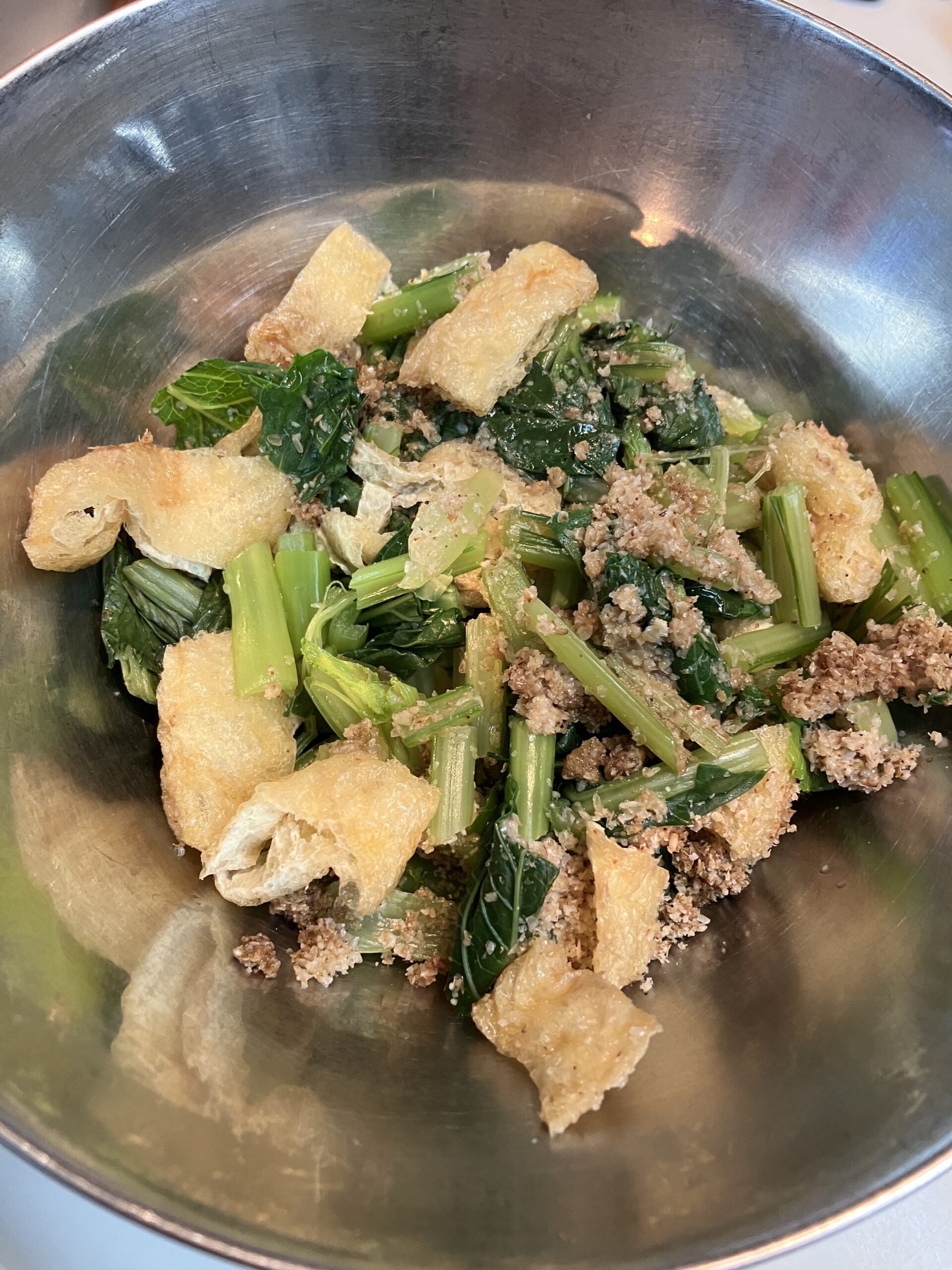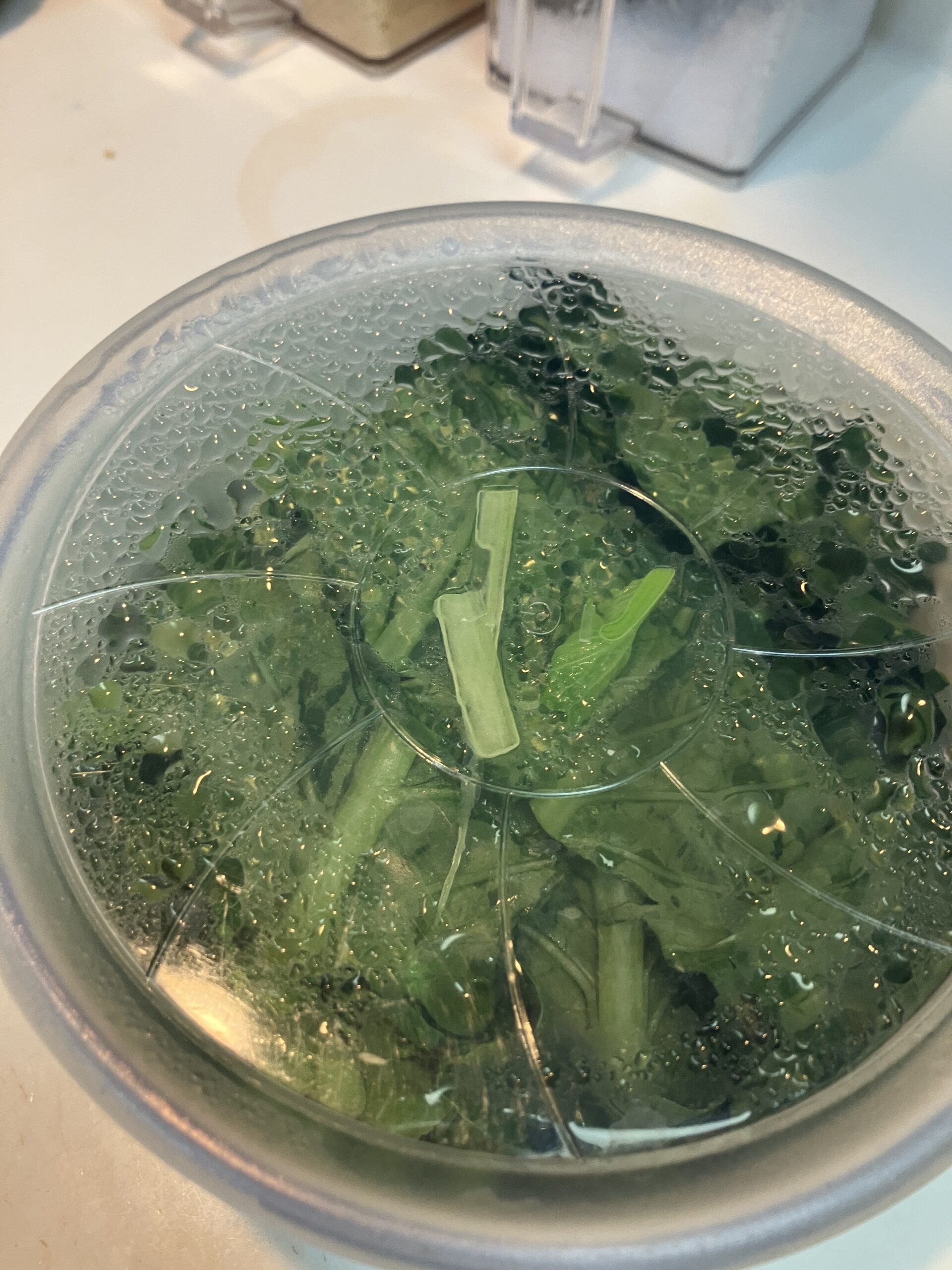 つづいて小松菜胡麻和え。小松菜は根元に切り込みを入れ泥を落とす。極力無駄を出さないように。耐熱容器に水と一緒に入れてレンチン少々。シャキ感が残る程度。油揚げとあえてゆで汁とすりごま、醤油で味付け。