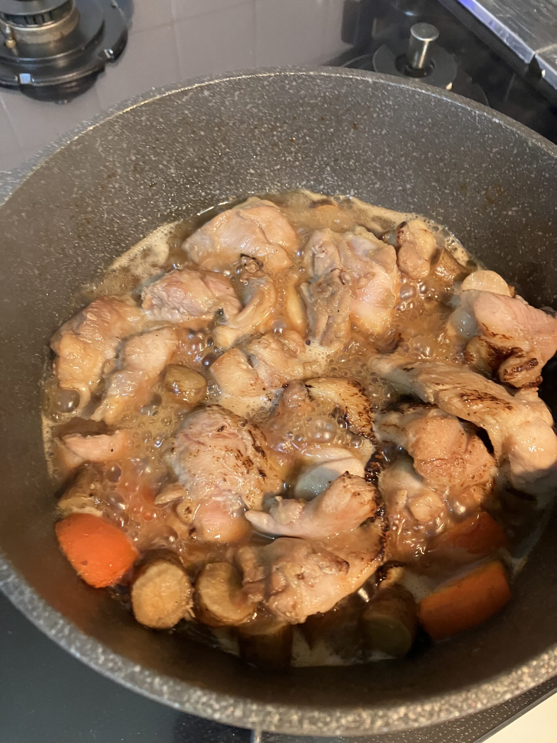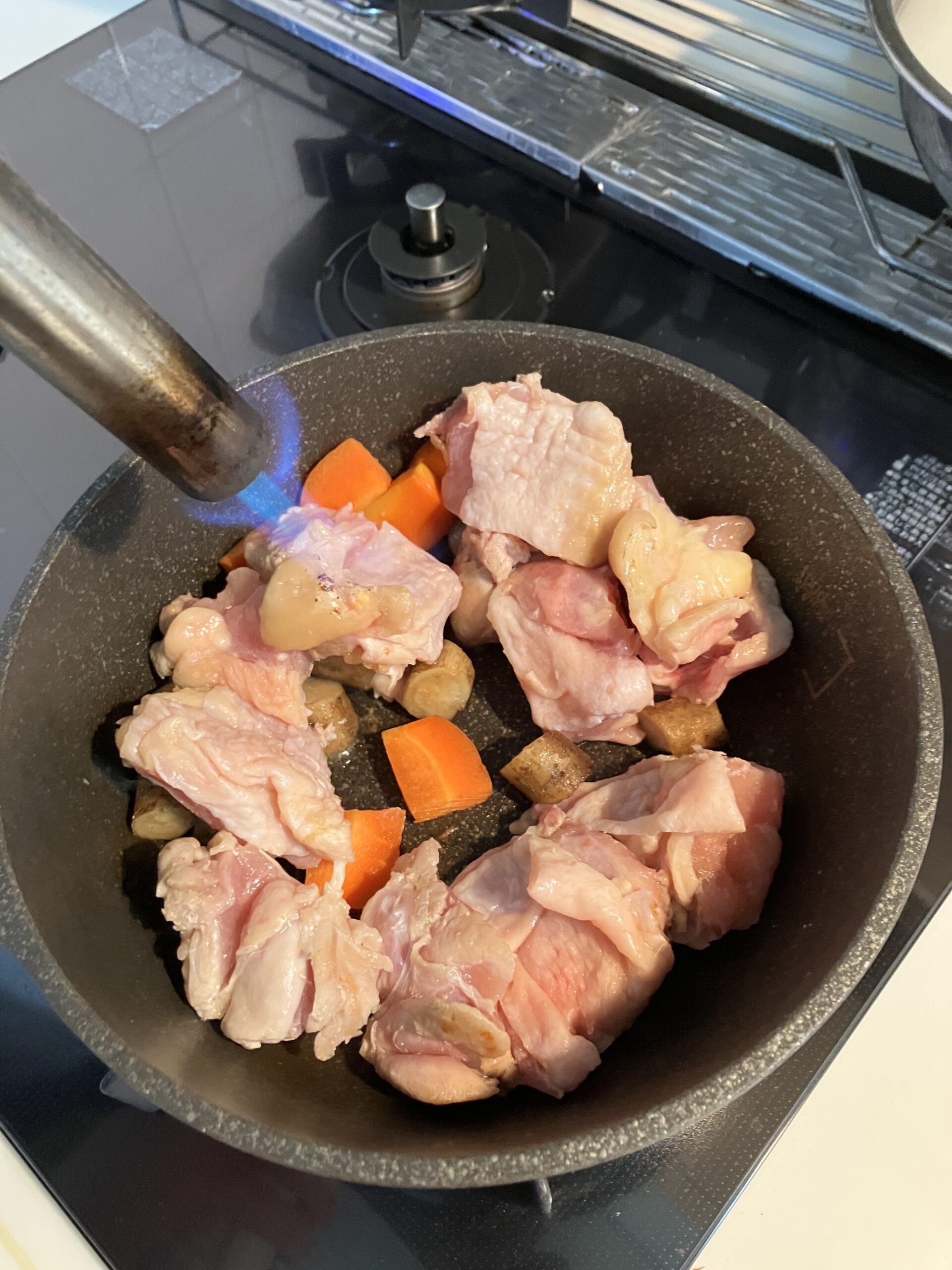 ようやく秋らしくなったある日。栗ご飯にしたかったので合いそうなおかずを作りました。まずは鶏の甘辛煮。ごぼうは皮は泥を落とす程度。アクも旨みと考えて切っていきます。人参と鶏モモを加えバーナーで鶏モモの皮をあぶってチーユー(鶏油)を出す。砂糖と醤油、みりんで味付け。