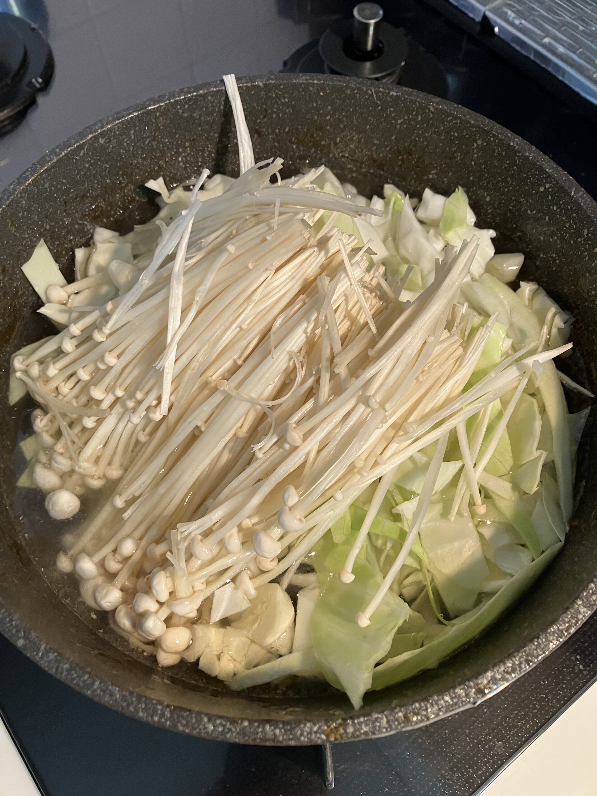 甘辛煮を皿に盛り付け、その鍋を洗わずみそ汁の具をいれて節水と時短(笑)。おしまい。